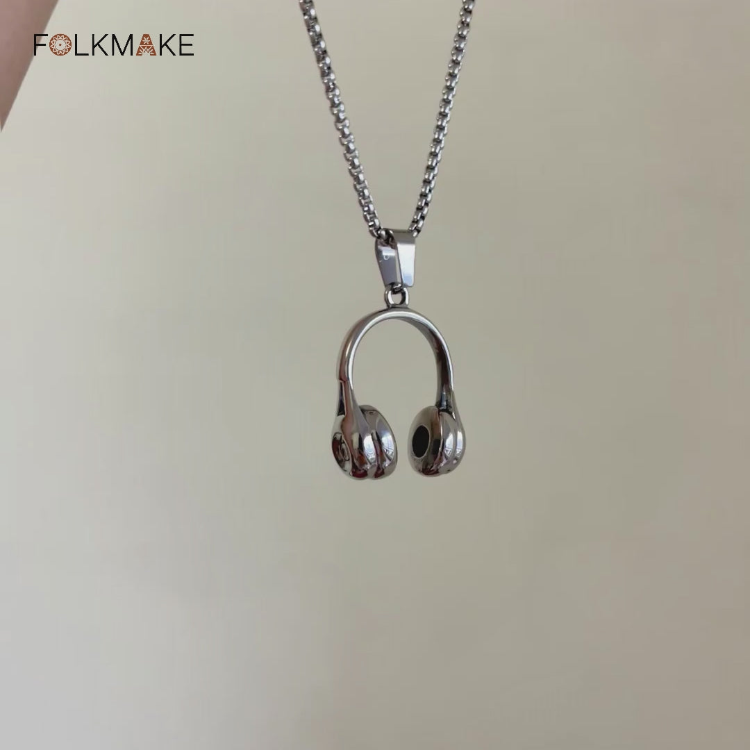 Small-batch handmade stainless steel headphones necklace on a box chain, made in China, inspired by everyday music moments with a clean, gender-neutral look.