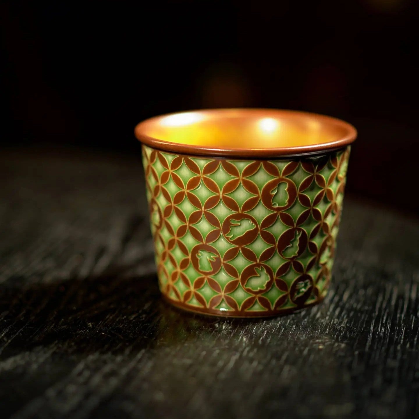 Small-batch handmade Longquan celadon ceramic cup made in China and shipped from China, featuring a coin-and-rabbit "Fortune Forward" motif carved with a yin-yang double-carving and glaze-fill method, then high-fired for a durable, heat-resistant, food-safe finish.