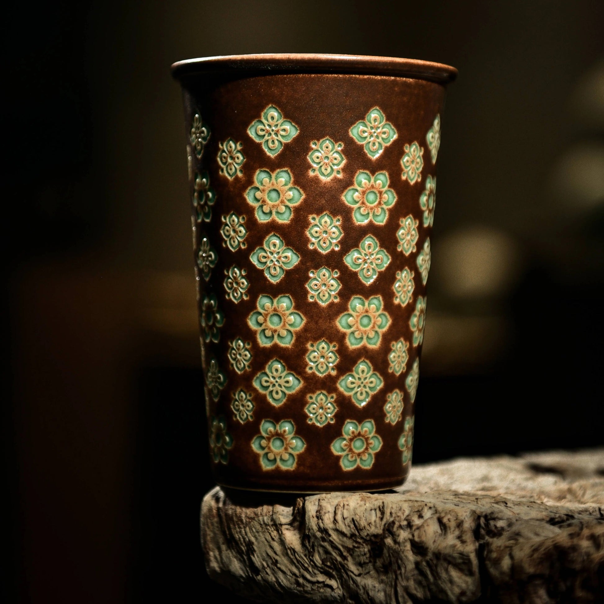 Small-batch handmade Longquan celadon ceramic cup made in China and shipped from China, featuring Auspice floral motifs carved with a yin-yang double-carving and glaze-fill method, then high-fired for a durable, heat-resistant finish.