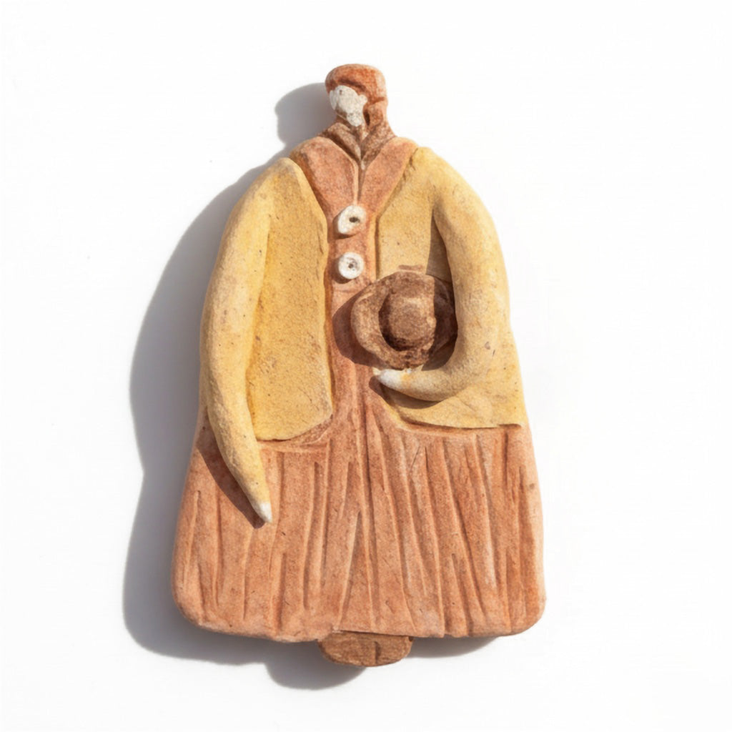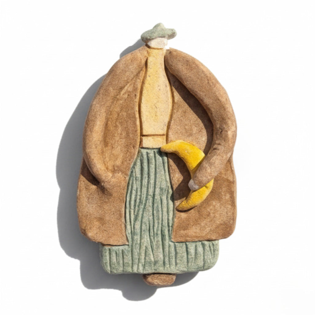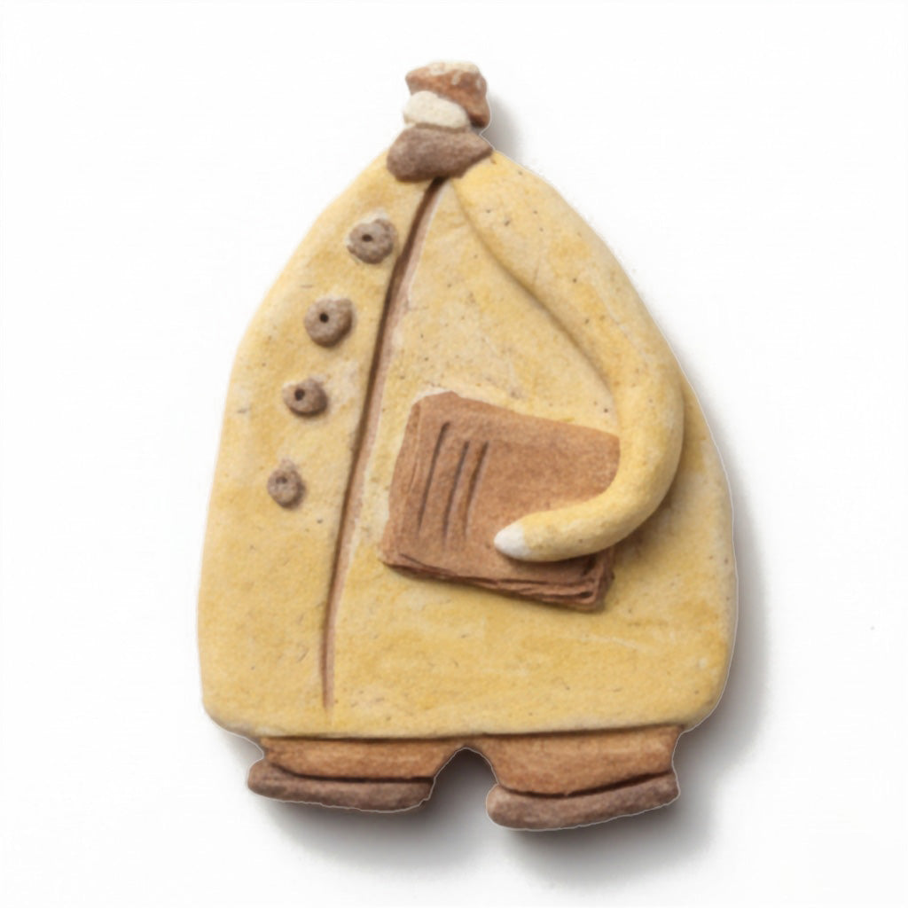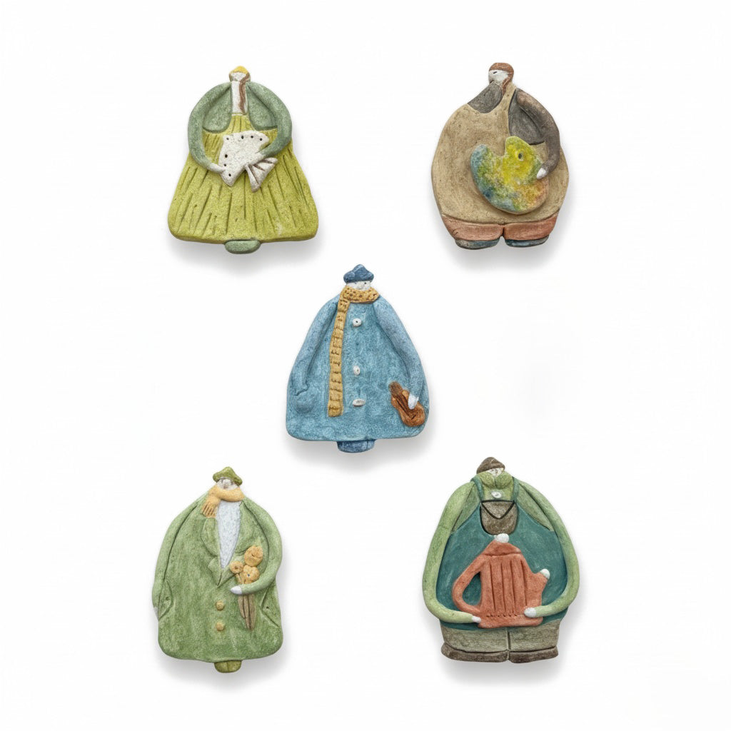 Each figure begins as a sketch of a small everyday gesture. Yizuo sculpts and refines the clay by hand, blending subtle pastel tones with mineral pigments before the first firing. After polishing, each piece is fired again at high temperature for strength and color depth. Final assembly, either pin back or magnet, is completed manually to preserve balance and detail.