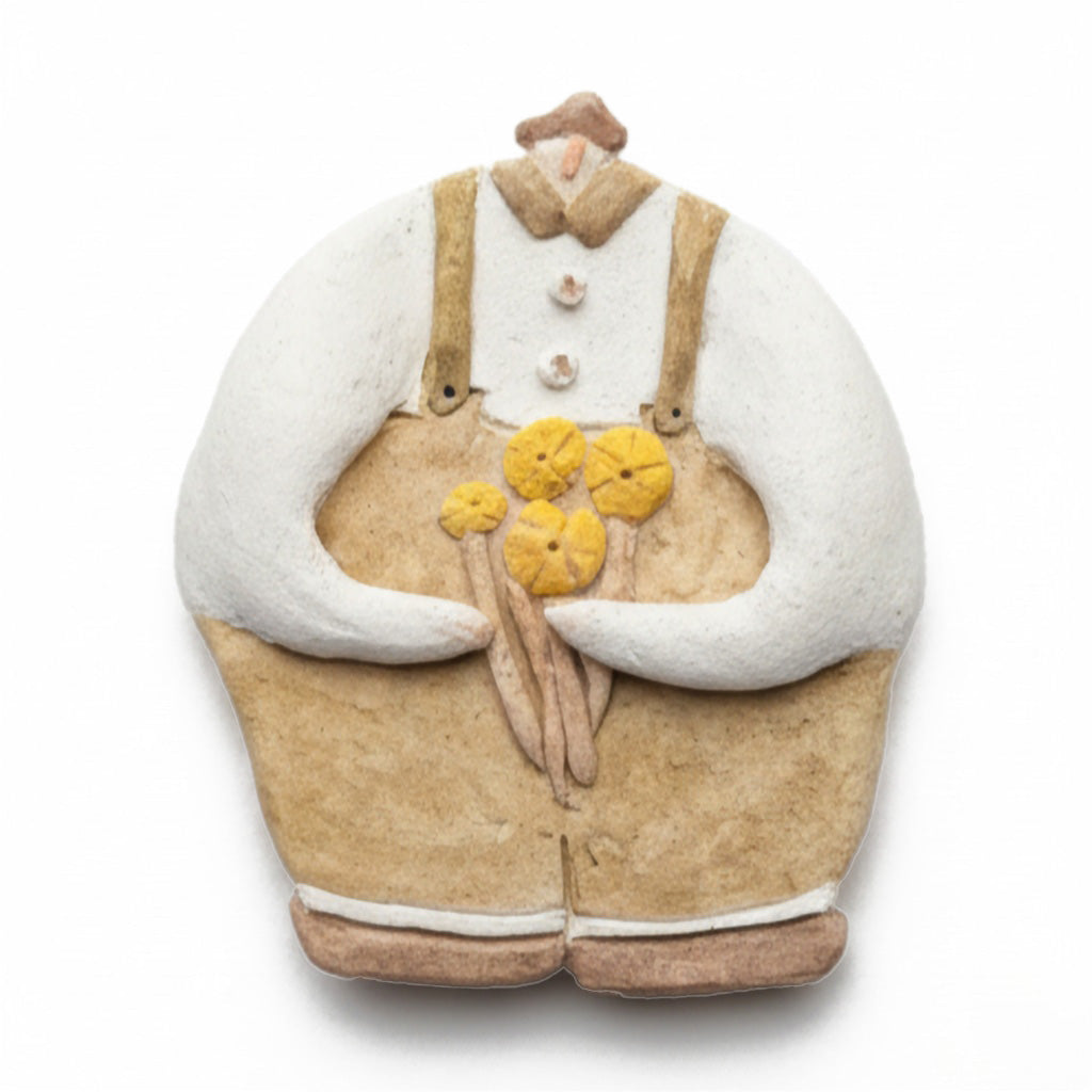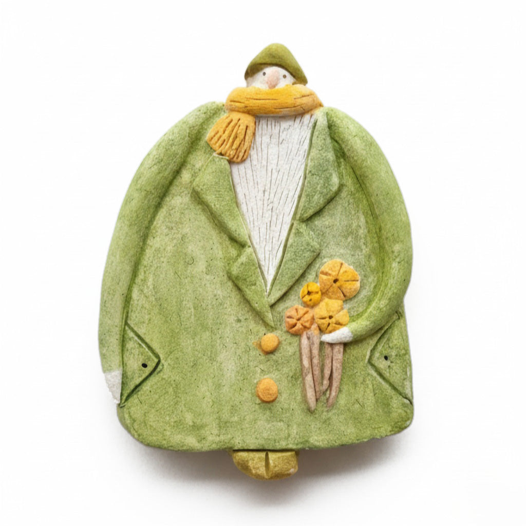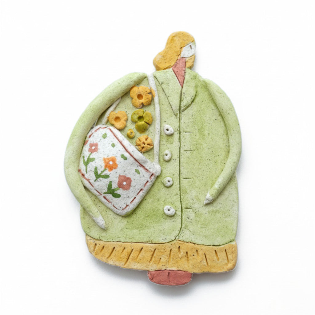 Handmade ceramic figures from China's Everyday Bloom series by craft artist Yizuo, available as brooches or refrigerator magnets. Each design portrays a serene daily moment, e.g. a person holding flowers, a book, or a cup, capturing the warmth and simplicity of bright, gentle living.