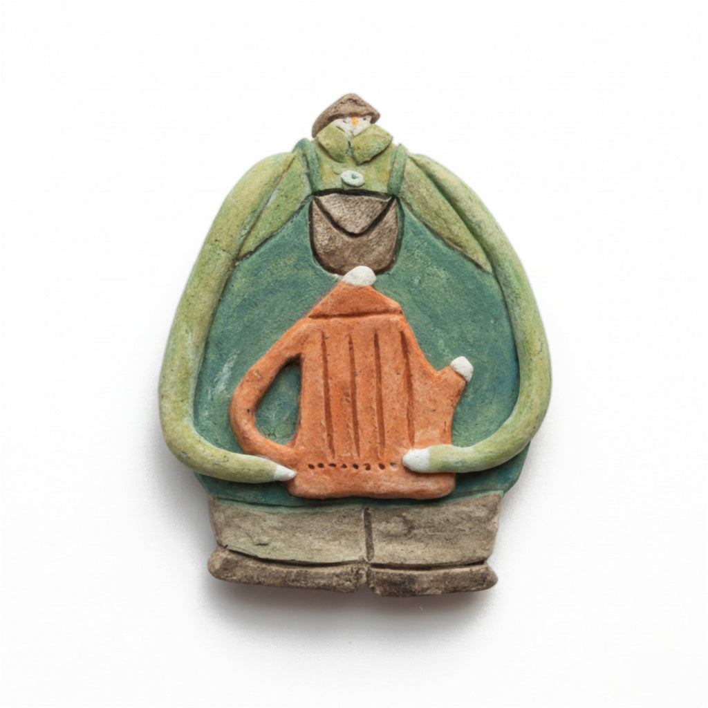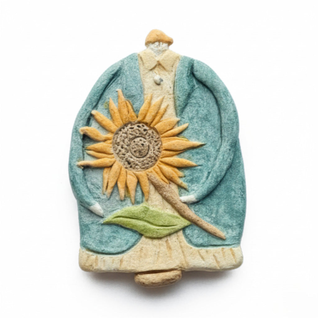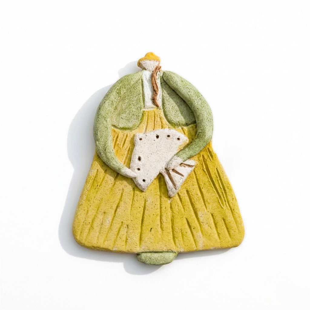 Handmade ceramic figures from China's Everyday Bloom series by craft artist Yizuo, available as brooches or refrigerator magnets. Each design portrays a serene daily moment, e.g. a person holding flowers, a book, or a cup, capturing the warmth and simplicity of bright, gentle living.
