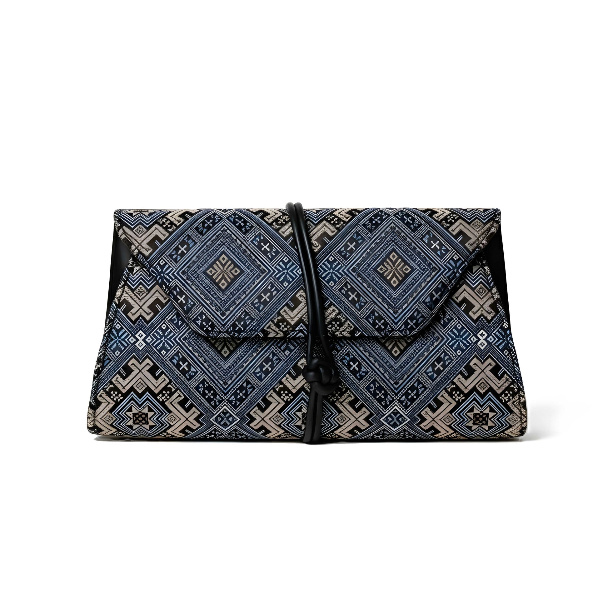 This clutch highlights classic diamond and cross motifs from traditional Zhuang textiles, symbols of protection, continuity, and interconnected paths. Recognized as a National Intangible Cultural Heritage of China, Zhuang brocade embodies centuries of artistry and symbolism passed down through generations. The cool blue-grey palette and precise pattern symmetry keep the piece visually calm yet distinctly characterful, making it a subtle statement for those who want heritage craft without excess ornament.