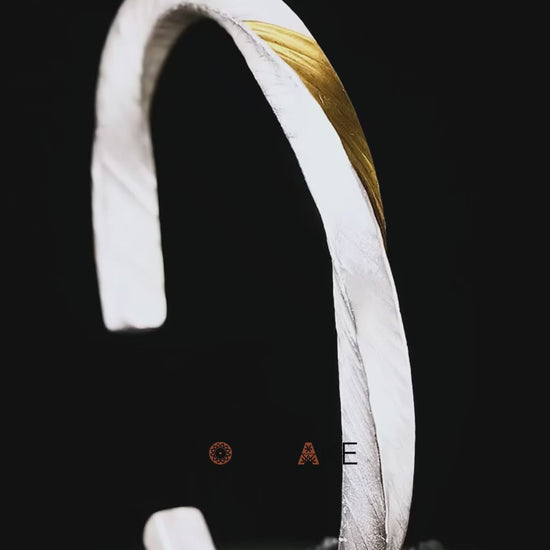 Viking Warrior Cuff Bracelet draws from the image of a Viking warrior - fearless, steady, and built for the long way home. The silver band is shaped into a subtle twist, like a tightened rope or a forged path, then finished with a rugged, mottled texture that feels raw and alive. A diagonal stripe of 24K gold film cuts through the surface like a flash of honor - a bright mark against weathered metal. Three finish options let you choose the mood: clean and bright, deep and shadowed, or a shifting, storm-sky sheen.